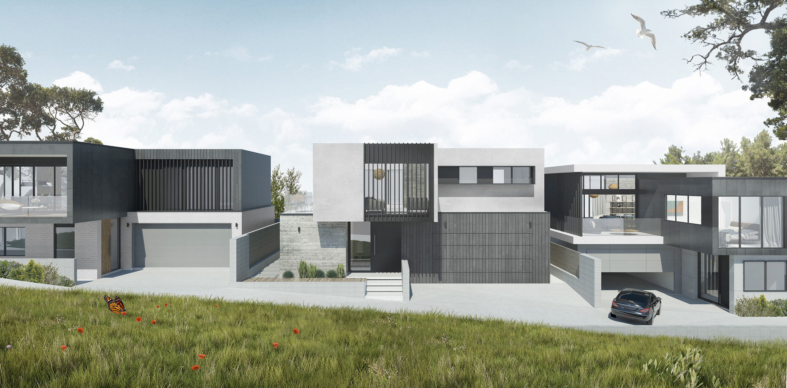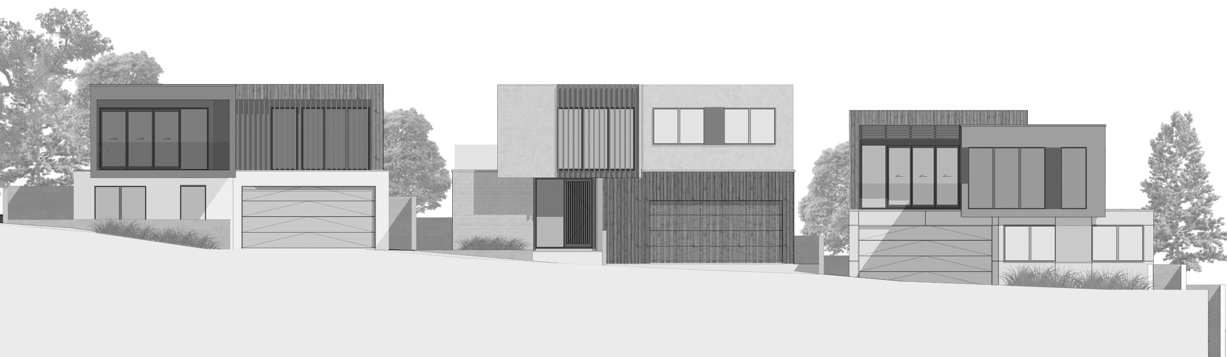 The branches of a large Pohutakawa at the entry of the site paints the perfect New Zealand Cliffside setting as the canopy shadows cast intricate of patterns of light onto the set of modern Villas proposed for this site.
