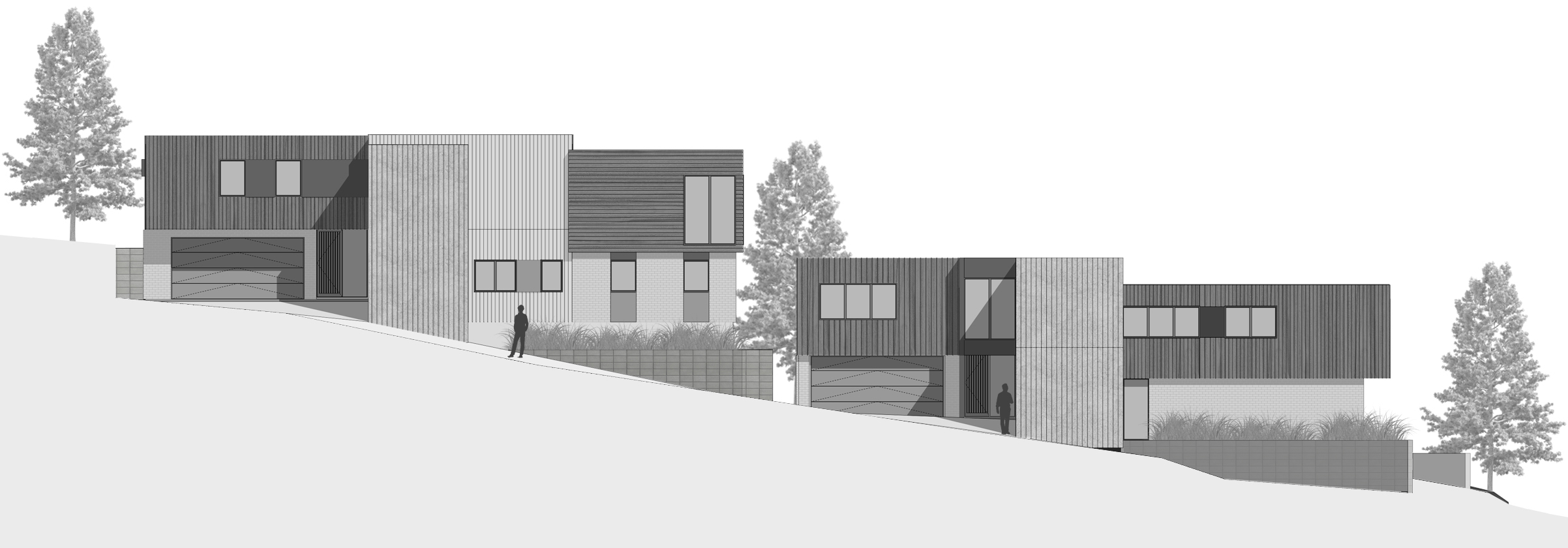 This steep site situated in Orakei, Mission Bay Auckland, climbs almost 10m from the roadside entry to the rear. The nature of the site immediately came with challenges; not only do the units have to step dramatically with split floor levels, but the height to boundary and maximum height controls were more difficult to avoid. We worked closely with the planner to overcome these controls and still produce an excellent, contemporary pair of units, each boasting large floor to ceiling heights, fluid indoor-outdoor flow and superb views over the neighbouring trees out towards Rangitoto island.